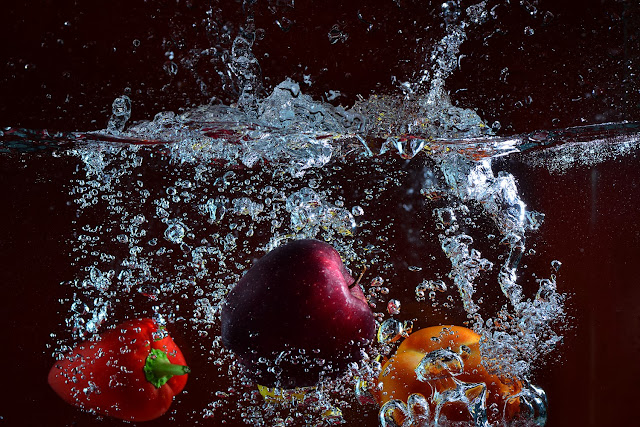 3. Drop the fruits in the water tank at approximately the same place where the camera is focused - and hit the remote at the same time.
